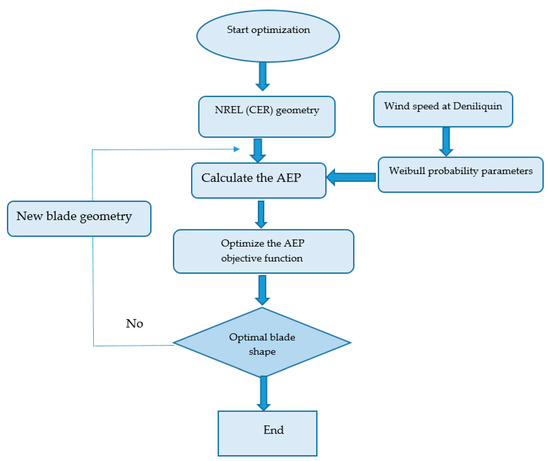 National Renewable Energy Labs (NREL) developed HARP_Opt in the USA [40]. The HARP_Opt open-source code is used to conduct the horizontal axis rotor performance optimization process. The HARP_Opt gathers a BEM theory code with a genetic algorithm (GA) code to optimize and design the wind turbine’s rotor shape. Genetic algorithms [41] are evolutionary algorithms, and they are robust and reliable search techniques depending on the mechanism of natural selection [42]. The optimization process of the GA is done by iterating a set of individual solutions, where a set of solutions is called a population. An iteration is carried out from one population to the next to obtain subsequent populations of superior individuals. The WT_Perf software (National Renewable Energy Laboratory, Golden, CO, USA) [43] is used as the essential BEM code in HARP_Opt. The WT_Perf is developed to analyze the aerodynamic performance of the wind turbine using the BEM code. The HARP_Opt uses the WT_Perf code to predict the performance of the rotor wind turbine and the MATLAB GA code to carry out the optimization. The HARP_Opt could be used for a single or multiple objective optimization code for the objective function in the HARP_Opt software, either maximization of the AEP of the wind turbine or wind turbine efficiency.