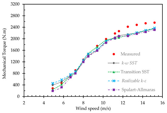 It is important to note here that at a flow velocity between 9.0 and 10.5 m/s, the boundary layer was driven from the laminar to the turbulent transition area where the onset of a stall occurs. The transition SST model made the best prediction for that region due to the fact of its ability to resolve the laminar transition that considers the turbulent boundary layer which starts at the stall phenomenon. After 10 m/s, the results showed a marked difference for mechanical torque between the measured and RANS models. The significant separation of the flow and stall phenomena played a role in the difficulty of mechanical torque prediction using the RANS models.