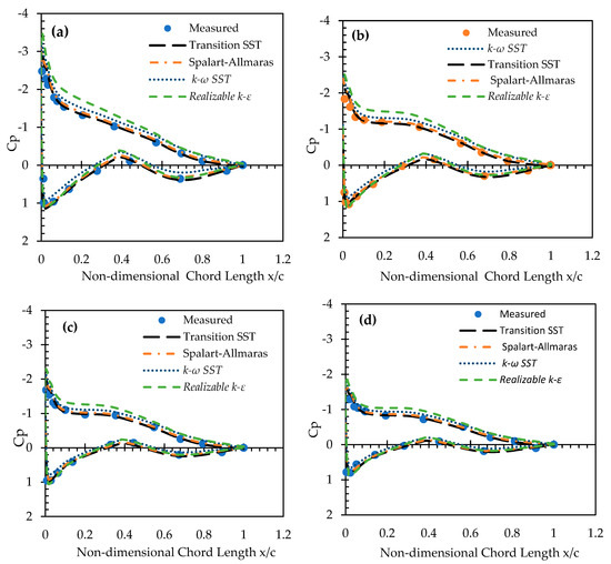 Figure 7 and Figure 8 show comparisons of the measured and computed pressure coefficients at the four most important radial span sections (0.47 R, 0.63 R, 0.8 R, and 0.95 R) for two different wind speeds of 7.2 and 10.2 m/s. The pressure coefficient is calculated as in Equation (7):