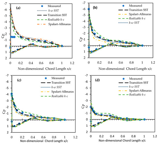 For a 7.2 m/s inlet wind speed, as shown in Figure 7, the modelled pressure distributions matched well with the experimental values, where the flow was almost attached to this wind speed with no stall boundary layer separation having yet started. Thus, all RANS models agreed well with the experimental data except realizable k-ε. In effect, this model had some limitations when the domain included two fluid zones, i.e., stationary and rotating zones [51]. In this case, non-physical turbulent viscosities were produced, and these affected the value of the turbulent viscosity. Since the present simulation had two domains, the realizable k-ε was not appropriate for predicting the current wind turbine simulation.