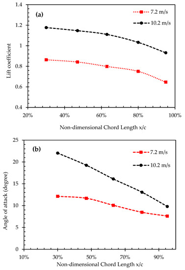 As shown in Figure 9b, the calculated angle of attack had a high twist angle of 12.13° at 7.2 m/s wind speed on a plane through the blade at a distance of 1.51 m. At the same length, the angle of attack at 10.2 m/s was 22.04°. Thus, the angle of attack increased with increasing wind speed and decreased with the radial position. At 7.2 m/s near the hub region, minor transition and separation may occur due to the slightly high angle of attack, but the flow was still below the stall region and almost always attached. When increasing the wind velocity, the angle of attack increased at 10.2 m/s to the onset of stall. At this wind speed, the full separation occurred between the hub and 80% of the tip sections. Thus, the separation on the flow from the leading edge to the trailing edge occurred at 47% section of the blade and remained until 80% section.