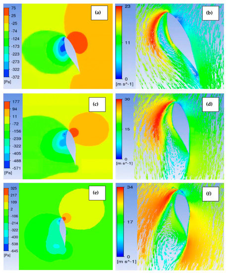 The flow behavior at different airfoil sections along the blade was visualized around the airfoil with velocity and pressure contours. Transition SST indicated good results amongst the four turbulence models with the measurements shown above. As such, the velocity vectors and pressure contours results were predicted by the transition SST model. The blade cross-section at a 1.51 m radius investigated the flow on the inner region of the blade. In contrast, the blade cross-section at a 4.78 m radius studied the flow on the outer area of the blade. The figures below explain that the pressure fell to a small value as the flow over the airfoil accelerated. As the results in Figure 10a,c,e,g,i illustrate, the pressure coefficient dropped quickly to zero and reached a negative value. As the flow slowed down, the pressure increased, and the magnitude of the pressure coefficient decreased. As a result, the pressure of the lower surface became far more significant than the pressure of the upper surface, causing the blade to rotate. These results confirmed that the values of the pressure coefficient were negative at high air velocity. The separation will start when the flow on the upper surface at the trailing edge of the airfoil decelerates and mixes with the airflow from the lower surface. The point of flow separation happens earlier at larger angles of attack, and as the intensity of the adverse pressure rises, the separation point shifts forward on the airfoil.