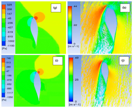 Pressure and velocity vector distributions at 7.2 m/s of different span stations: (a) pressure and (b) velocity vector of 30% span; (c) pressure and (d) velocity vector of 47% span; (e) pressure and (f) velocity vector of 63% span; (g) pressure and (h) velocity vector of 80% span; and (i) pressure and (j) velocity vector of 95% span.