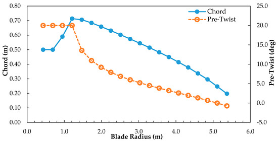 Specific design parameters should be in place to generate acceptable blade geometry [28,49,50]. In References [49], the maximum and minimum values for twist angle and chord length at the control points were decreased along the radial direction as the following equation: