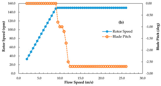In this study, the optimization process modified the shape of the blade design using chord and twist distribution along the blade. The chord and twist distributions of the optimized wind turbine blade are shown in Figure 12. The power coefficient of the optimized rotor with wind speed is depicted in Figure 13a.The power coefficient had the highest value of 0.433108 until the rated wind speed (9.5 m/s). Due to the Weibull probability density function being high in the low wind speed range, it is essential to have a high-power coefficient to increase the AEP. The blade pitch control is the variable pitch to stall angle; the control system will be able to brake the turbine at high winds safely. As shown in Figure 13b, the variation of rotor speed and pitch angle with different wind speeds shows the change of rotor speed and pitch angle with varying speeds of wind. The rotor speed at the cut-in speed (2 m/s) was approximately 32.98848 rpm. The pitch remained at 0°, while the rising wind speed improved the rotor speed to 148.4482 rpm at the rated speed of 9.5 m/s. The active pitch control began at this point and regulated the rotor speed to 150 rpm until 25 m/s was reached.