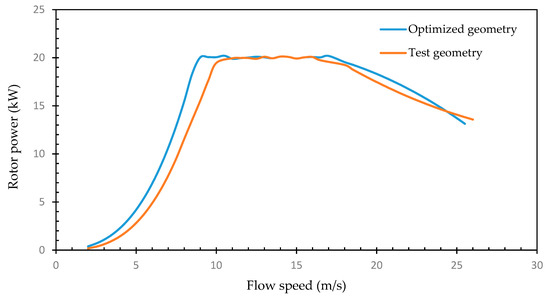 The objective of the optimization process was to maximize the AEP of 20 kW wind turbine depending on the wind speed data in Deniliquin using the output of optimal chord length and twist distributions along the wind turbine blade. In this study, a single objective method was considered where the optimization was focused on the optimization of the aerodynamic shape without including structural optimization studies [44,45,46,47,48]. The Bezier curves were used to define the chord length and twist angle distributions to smooth the span-wise distribution along the blade. There were five control points for each chord length and twist angle parameters; thus, the total overall decision variables amounted to 25 control points. The same rated power, the rotor diameter, and the hub height were used as input in HARP_Opt, with the baseline validated wind turbine model as shown in Figure 5. In this study, the variable rotor speed and variable pitch control were used for the control system to produce more energy output [32]. The allowable rotor speeds range from 25 rpm to 150 rpm. Table 3 below summarizes different parameters of turbine configurations.