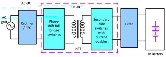 Many methodologies have been proposed for treating the issues of the OBC chargers [,,]. However, they suffer from some disadvantages such as complex configurations and/or complex control schemes, high-cost solutions, narrow load regulation characteristics, and limited efficiency improvement. The block diagram of the conventional OBC charger systems is shown in Figure 1. The structure is composed of two stages; the first is the rectifier (AC–DC) or power factor correction (PFC) circuit, and the second is the high-frequency link DC–DC converter charger, including high-frequency (HF) transformer isolation. A filter can be an option for DC current smoothing for a high voltage battery pack. However, utilizing HF transformers for galvanic isolation and a wide range of output voltage has a negative effect on power density and efficiency characteristics [,,,,]. Normally, the total efficiency is about 94% because of the multi-stage structure configuration. However, it is difficult to improve the overall efficiency in the multi-stage structure.