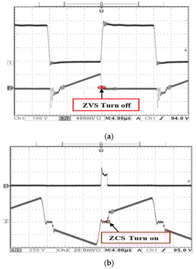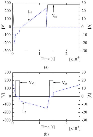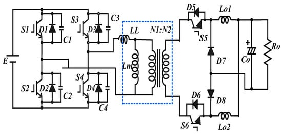 Various soft-switching high-frequency-linked DC–DC converters have been introduced for on-board EV battery chargers [,,]. Phase-shift modulation (PSM) full-bridge (FB) DC–DC converters have been widely utilized in several works []. Zero-voltage soft-switching (ZVS) of semiconductor devices is achieved with constant switching frequency operation []. However, these full-bridge phase-shift converters have several drawbacks, such as high circulating current and narrow ZVS range. Due to the extended range of chargers’ power regulation, the lagging-leg switches cannot realize ZVS soft-switching at light-load operation conditions []. Continuous improvements have been developed in order to prolong the ZVS soft-switching range [,,,]. One method to extend the soft-switching range is by using additional passive auxiliary circuits to the conventional phase-shifted power converter. However, the primary current continues circulation through the primary circuit during the freewheeling intervals causing extreme conduction losses. Additional active switch circuits or extra HF transformers are utilized for the reduction of the circulation current [,]. However, these additional components increase the total cost. Moreover, secondary-side diodes are subjected to high voltage spikes and oscillations during turning-off. Thus, the reverse recovery of rectifying diodes in secondary-side causes oscillations and high-voltage overshoots because the EV battery pack voltage is usually high [,,,,,,,,,,].