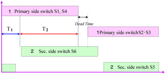 where T1 is the ON period of switch S6 that overlaps with the on-time of S1 and S4. The total on-time of switches S1 and S4 is equal to T1 + T2.