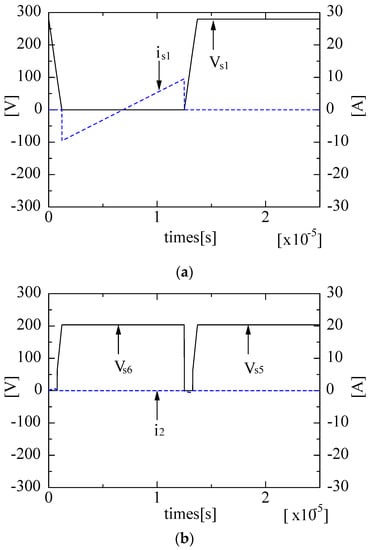 Steady operation waveform by simulation in the case of rated output (duty factor = 0.9). (a) Primary-side switch voltage Vs1 and current is1. (b) Secondary-side switches voltage and secondary-side current.