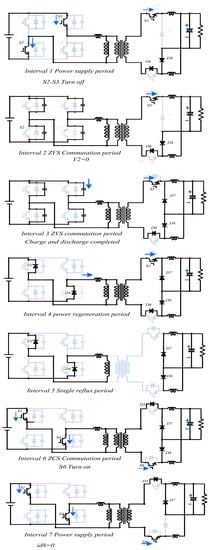 In order to investigate the operation of the studied converter, one assumption is considered. The switching devices are assumed to be ideal isolated gate bipolar transistors (IGBTs), excluding the parasitic capacitors and the reverse conducting diodes. All IGBTs have the same parasitic capacitances. The rectifying diodes are assumed ideal, and the output filter inductor LO is massive enough to be treated as a constant current (CC) source during periods of switching. The output voltage is regulated in the conventional phase-shift manner using the driving signals depicted in Figure 3. As depicted in Figure 6, there are seven operating intervals in one switching cycle t0–t7 (from Interval 1 to Interval 7. The operation principle of one cycle is described, and the equivalent circuits of each operating interval are shown in Figure 6.
