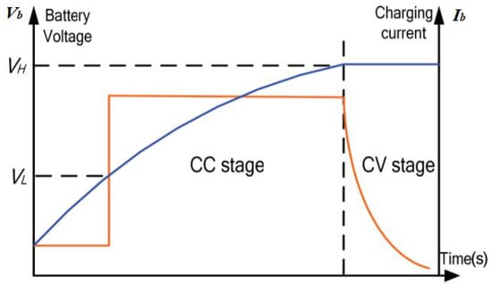 The charging strategy is consisting of two stages; the first is the constant current CC stage; the second is the constant voltag (CV) stage. As presented in Figure 7, the charging current Ib decay as the voltage Vb of the battery increases. Firstly, the EV battery is charged at a constant charging current until the EV battery voltage equals the predetermined upper-limit voltage VH. Then, current decays exponentially with a constant voltage charging until the current reaches a predefined minimum-limit current.
