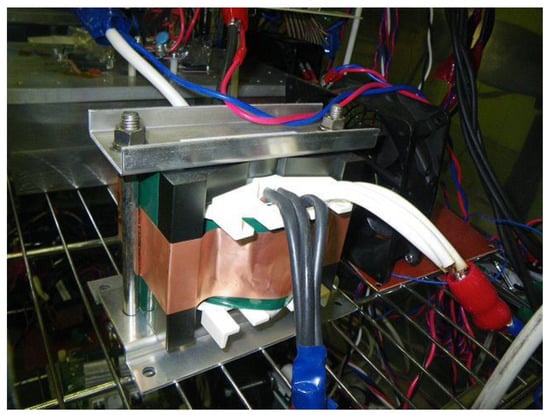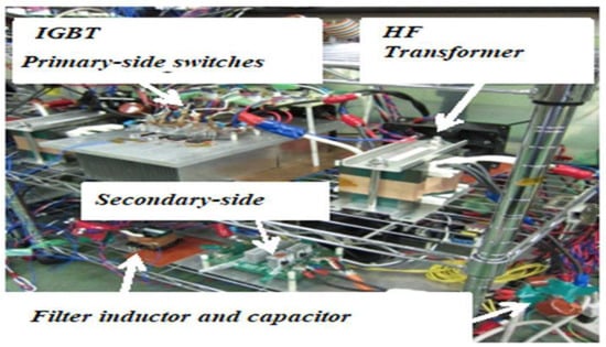 An experimental setup of a 3.2 kW battery charger prototype is implemented. The high-voltage (HV) nickel–metal hydride (NiMH) battery is substituted as an electronic load prepared in the laboratory. The AC source is given by an AC power supply in the early stage of the experimental setup. The used high-frequency transformer with a ferrite core (Ferrite PQ107) installed in the DC–DC converter is shown in Figure 8. The semiconductor devices in the charger circuit by using IGBTs with 600 V rated voltage in the charger circuit (SKM150GB128D Vces = 600 V, Ic = 150 A (25 °C)). The power losses are calculated under the condition of the rated output power. Figure 9 shows the appearance of the implemented phase-shift full-bridge DC–DC converter with current doubler in secondary-side suitable for OBC charger systems.