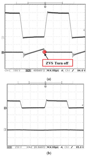 The proposed charger was designed to achieve soft-switching conditions. These conditions ensure ZVS turn-on from no-load to full loading and to diminish the circulating current produced in the primary-side. In this design, the proposed on-board charger is controlled using a pulse width modulation (PWM) technique with a constant frequency. Two control loops are used for the implementation of the EV battery charging controller. The first is the current inner control loop, and the second is the voltage outer control loop. This control scheme is based on the CC–CV charging algorithm: two PI-type controllers are used to adjust the charging current and EV battery voltage. Thus, the appropriate duty cycle is produced for charging the EV battery. Figure 10 shows the ZVS waveforms in the lagging-leg in the case of a 0.9 duty cycle (in secondary switches) during the normal EV charging process. The waveforms of primary-side switches after changing the duty cycle to 0 in the secondary side are shown in Figure 11. From these two figures, the lagging-leg switches in the studied charger circuit are fruitfully turned ON, achieving ZVS in different loading conditions.