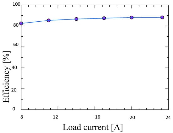The primary switch current and voltage measured waveforms are shown in Figure 10. As one can notice from Figure 11a, all active power switches in both full-bridge-arms can realize soft-switching operation. In this situation, the inner upper-side and outer lower-side switches S1 and S4 can achieve a ZVS soft-switching operation. Figure 12 illustrates the output current versus efficiency characteristics of current doubler secondary with semiconductor devices rated 600 V. Interpolation of experimental data is used in this figure when a theoretical model is unavailable. We Interpolate between two measurements and observations to save money and time. The simplest interpolation method is to locate the nearest data value, and assign the same value. One of the simplest methods is linear interpolation. Linear interpolation is quick and easy, but it is not very precise.