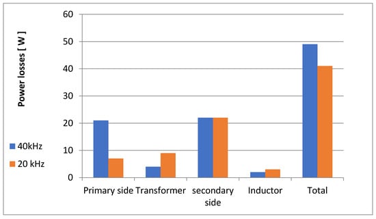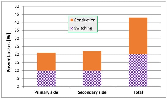 Figure 13 depicts the quantitative power loss analysis for active switches in the proposed charger circuit by using IGBTs with 600 V rated voltage in the proposed circuit topology. The loss constituents can be categorized into primary-side power switches, HF transformers, and secondary-side rectifier switches and an inductor filter as the loss components. The power losses are calculated at the rated output power condition of 3 kW. One can realize that the overall consumed power losses of the whole circuit are 49.5 W in the case of 40 kHz switching frequency. Figure 14 describes the evaluation of loss components under typical operation. The loss constituents can be categorized into conduction losses and switching losses. The primary-side losses are due to primary-side IGBTs. The secondary-side losses are due to IGBTs and current doubler diodes. The switching losses are calculated in the case of 40 kHz switching frequency. The total switching losses are 20 W and the total conduction losses are 23 W. However, the conduction losses are 15% higher than switching losses due to soft-switching operation.