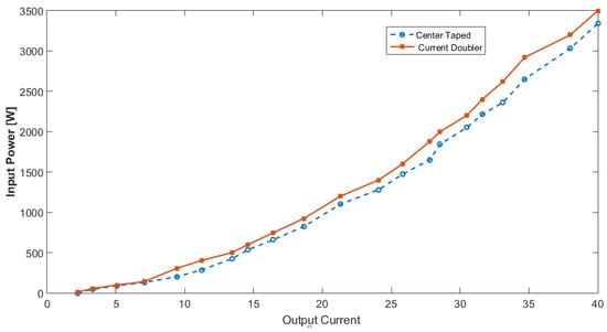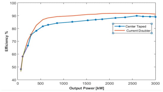 Figure 15 illustrates the charger output power characteristics comparing the current doubler (CD) topology with the center-taped (CT) secondary-side circuit. From this figure, the proposed power converter circuit can deliver its output current, achieving soft-switching operation. In the case of rated power settings, the proposed power converter can achieve a measured efficiency of about 92%. Figure 16 depicts the measured charger efficiency during the EV battery charging period. As appears in Figure 16, the studied on-board charger achieves a better performance as compared with the conventional hard switching charger. This is owing to the wider ZVS soft-switching range, reduced circulation current, ZCS operation for all the active switches, and lower turns ratio. The implemented charger has a maximum efficiency of about 96% at rated-load charging conditions during one cycle of the CC–CV charging scheme. Figure 15 shows the efficiency characteristics of the converter with a secondary-side current doubler as compared with the center-tapped DC–DC converter. In this case, the active power switches are rated 600 V. Noticing this figure, the measured efficiency of the studied charger is higher than that of the previously developed charger with the center-tapped circuit in the secondary-side [] and two-level circuit with the current doubler DC–DC converters in a wide range of charging current ratings.