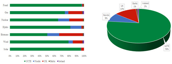 32] for the year 2017. Moreover, the proportions of the annual consumption and the installed capacities per type of production, each of the considered synchronous grids, in the total European power system, have been obtained from [