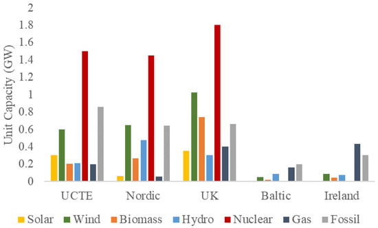 UCTE is composed of Luxembourg, Croatia, Slovenia, Slovakia, Hungary, Austria, Belgium, Netherlands, Czech Republic, Greece, Bulgaria, Germany, France, Malta, Italy, Romania, Portugal, Poland, Spain, and Cyprus. The Nordic grid includes Sweden, Denmark, and Finland. Although Western Denmark is part of the UCTE grid, it is assumed that both western and eastern parts of Denmark are included in the Nordic grid and Norway is also excluded, since it is not part of the EU-28 countries. UK grid covers Great Britain, the Baltic grid is composed of Lithuania, Latvia, and Estonia and the Irish grid includes Ireland. Each of these is simulated utilizing the model developed in [