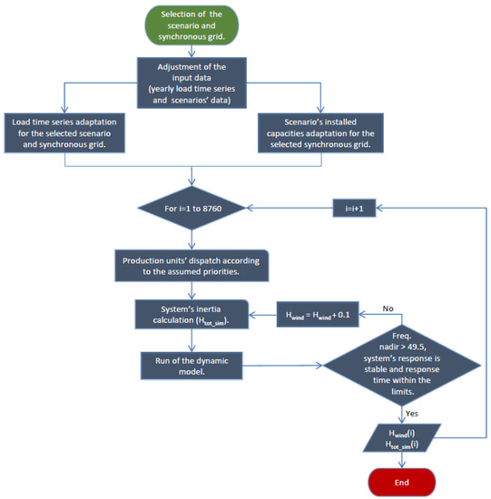 32]. The need for additional inertia to keep the frequency stable and within the acceptable limits, as set by the ENTSO-E (i.e., 49.5–50.5 Hz), is calculated for all the synchronous grids and for each scenario. The algorithm runs iteratively checking the value of the frequency nadir and the response time of the system. Whenever the response time deviates from certain limits, that are set according to the hydropower model as was described above, or the frequency nadir falls below 49.5 Hz, wind turbine’s emulated inertia (H