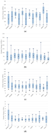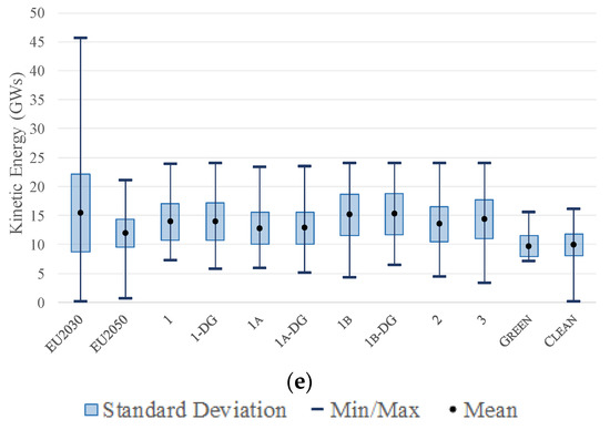 Figure 6a, UCTE grid’s requirement for additional inertia is illustrated. As can be observed, the maximum need ranges between the values 365–636 GWs, with the Green scenario presenting the highest value, while the minimum value varies between 0 and 206 GWs. The mean values depend on the scenario, with an average between all of them, lying around to 262 GWs. In most of the scenarios, the requirement is to be observed highly dispersed during the year. Nonetheless, there are simulated hours, where the need is double the mean value, indicating the worst cases during the year.