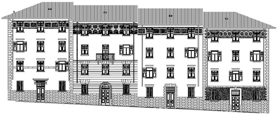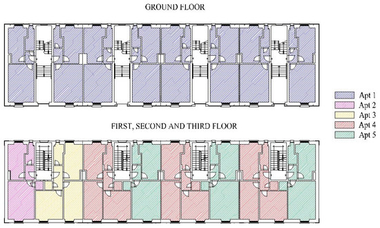 An existing building in Trieste, a city in north-east Italy, whose main features have already been described [11], was chosen to run the reliable optimization. It is composed by four blocks with apartments adjacent to each other. Each block consists of four floors with two small apartments each. The ground floor apartments consist of a kitchen, a bathroom and a bedroom. Each level above the ground floor features two apartments which, respectively, contain one and two bedrooms, a bathroom and a kitchen. The ground level floors and the third level ceilings are adjacent to aerated spaces. The base building was built with massive structures without insulation; the thermal characteristics of external walls have been measured using a heat flow meter, as reported in [19]. The energy refurbishment was carried on by adding insulating layers to the vertical and horizontal internal surfaces in order to preserve the facades. Figure 1 presents the façade of the buildings, while Figure 2 presents the floor plans with five types of flats; Table 1 presents the percentage of characteristic area for each one.