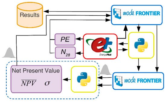 With reference to Figure 3, a Python script has been created in order to allow modeFRONTIER to drive the optimization. The Python script implements the “eppy” library using the parameters provided by the optimizer. It modifies the building model characteristics, creating IDF objects, the script than runs the EnergyPlus simulation, and reads the results of a single run providing the optimizer with the Primary Energy PE, the number of exceeding hours in summer period N28 and computes the investment cost C0 and the cash flow Si. The second modeFRONTIER project is then invoked, the stochastic economic parameters are generated, according to statistical distributions and the computed investment cost uniform distribution is generated considering a variation of C0 ± 10% of the computed value. Using the generated input statistical distributions, the NPV output distribution is computed using Equation (6), obtaining the required percentile that is transferred to the outer project. Primary energy, the number of exceeding hours N28 and NPV 10th percentile are used as optimization objectives by modeFRONTIER external project in order to define new designs. The computation workflow is represented in Figure 3, where a little Gaussian shape identifies the input and output of parameters with stochastic distribution, while the part enclosed by the dotted line identifies the stochastic simulation. The computation of NPV percentiles has been carried using the polynomial chaos implemented in modeFRONTIER. However, it is worth mentioning that as an alternative solution, a Monte Carlo approach could have been implemented, but with a far slower convergence.