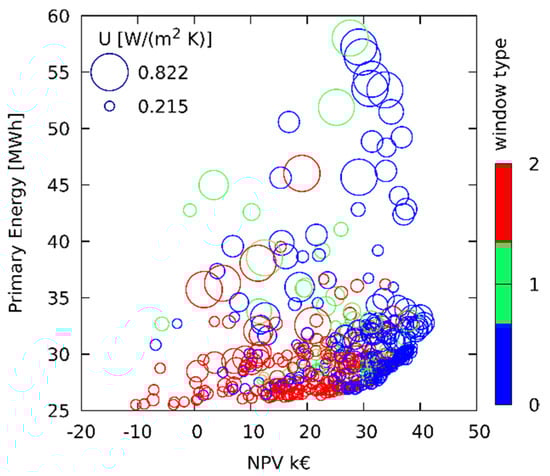 Optimizations results are reported using bubble-plots to present up to four variables. The bubble diameters are proportional to the external walls’ thermal conductance, south and north oriented, that covers most of the heat losses. Bubble colors represent window types; that is, blue is Type 0, green is Type 1 and red is Type 2. The 10th percentile of NPV and primary energy are the axes of the plot. Since the abscissa of plots is the 10th percentile of NPV, it is worth noting that the reported value means that the 90% of possible solution shows a higher value of NPV, depending on the real values attained by the stochastic parameters.