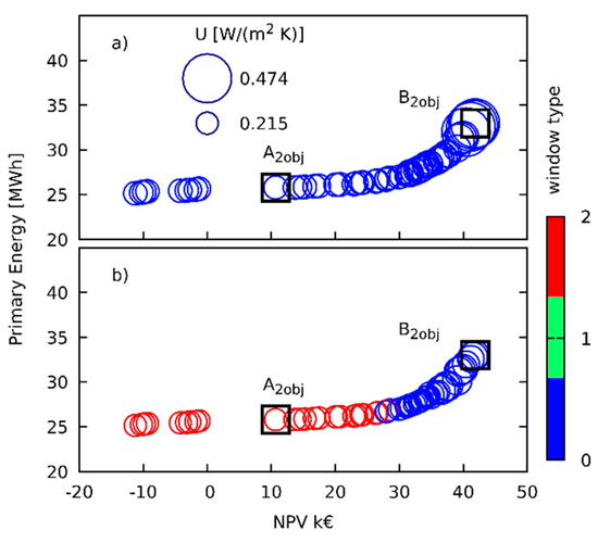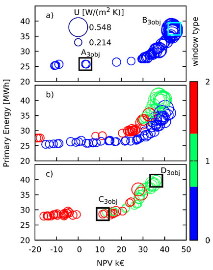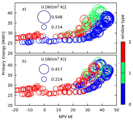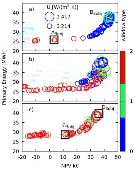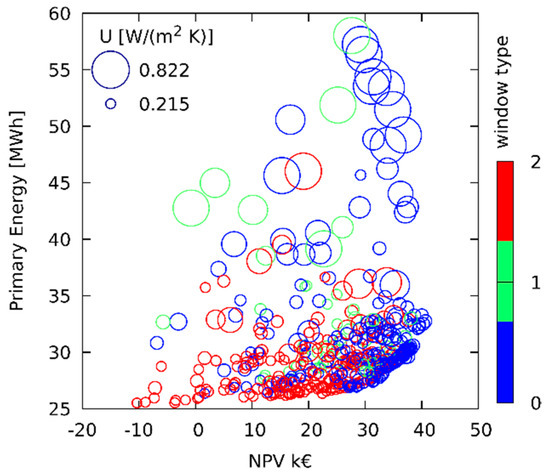 Figure 4 and Figure 5 refer to optimizations performed using two objectives only, to make the plots clearer they represent the results of only 20 NSGA iterations, it is worth noting as the solutions evolve towards the Pareto front. The inspection of Figure 4 shows that with low energy footprint the solutions are characterized by high insulation levels, as can be inferred by low circles diameter. When the solutions move towards the right of the abscissa axes, the insulation decreases, as can be inferred by the larger diameter of the bubbles. The analysis of window selection is very interesting. In this case, the most performant window is selected only with low energy solutions with low NPV. However, when the solutions evolve towards high NPV values, the optimization selects the less performant one; in this case, the lower investments drive the solutions towards lower insulation levels. Figure 6 presents the comparison between the Pareto frontier of the solutions related to the north and south façades, the figure shows how the optimization selects opaque walls transmittance and drives window selection. Window Type 1 is seldom selected and never for solutions pertaining to the Pareto frontier. For the south wall façade, the solution for windows is always the Type 0, with the highest value of transmittance. On the other hand, on the north wall windows, Type 2 are selected for the low energy case, while Type 0 is the one selected for the high NPV case.