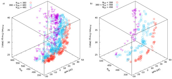 Figure 7 presents the designs for the three objective optimization: the additional objective is represented by the minimization of the maximum number of hours over 28 °C, namely N28, for each apartment of the building. In order to highlight the correlation between the parameters and the number of exceeding hours, the designs are categorized as the ones with N28 below 380 h, between 380 and 480, and over 480 h. Figure 7a presents the whole set of designs, while Figure 7b presents the solutions on the Pareto Frontier. Figure 8 presents the solutions of the Pareto frontier for the south and north wall using bubble plot representation: as before, the circle diameter is proportional to wall conductance, while the color identifies the window type. However, Figure 8 is difficult to analyze, since no information is given about the N28 objective, therefore the designs are separated in Figure 9 and Figure 10 using the aforementioned categories depending on the value attained by the N28 objective.