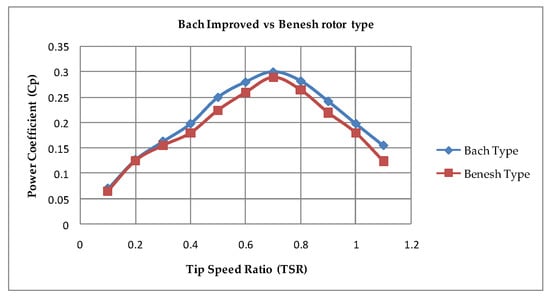 The results show that both profiles used in the experiment have maximum power coefficient at TSR values in the range 0.8–1.2. The maximum power coefficient is registered by the Benesh profile of 0.31, while the conventional Savonius profile has registered 0.27 [17,20].