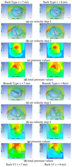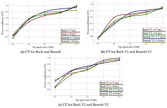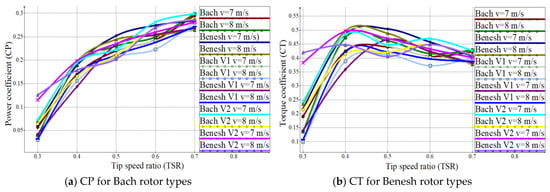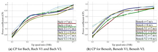 The values for the power coefficient (CP) as a function of tip speed ratio (TSR) for the Bach and Benesh models (Figure 9a) show uniformity overall in the field of interest presented with slight variations for Bach at v = 7 m/s and v = 8 m/s air inlet velocity in the 0.4 TSR zone at 0.17–0.19 CP. The Benesh model has higher values for the TSR range 0.5–0.6 with CP values up to 0.27. In contrast, the Bach model has the highest power coefficient (CP) value of 0.28 to 0.7 TSR.