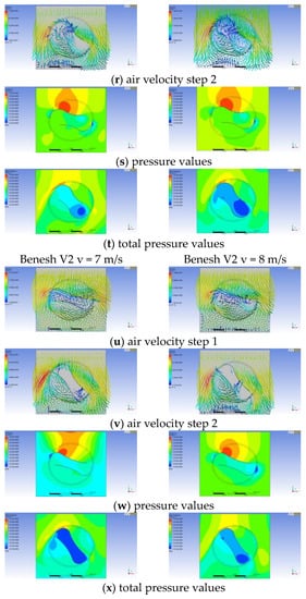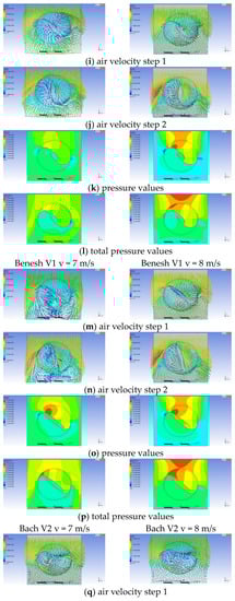 The specific air velocity and pressure values recorded for each analyzed rotor model with different blade geometry configuration are presented in Table 6.