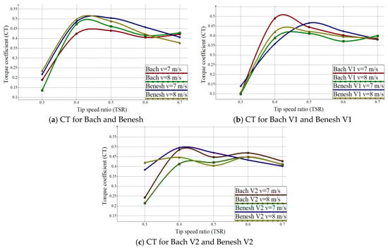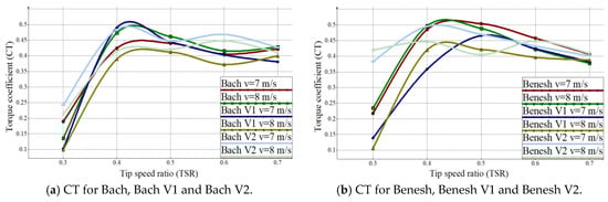 The Bach V2 and Benesh V2 models (Figure 10c) show considerable value differences of the torque coefficient (CT) for 0.3 TSR. Thus, the Bach V2 model has a lower torque coefficient (CT) for the TSR 0.3 of 0.22–0.29, while the values for Benesh V2 model are at 0.37–0.42 CT. At TSR 0.4 Bach V2 has values between 0.42–0.48 CT, while the Benesh V2 model has values between 0.44–0.49 CT.