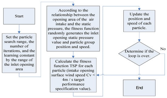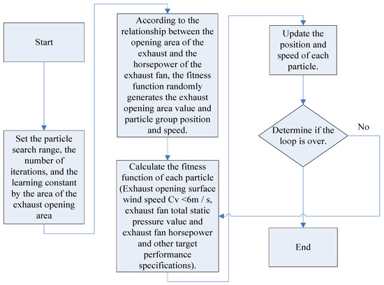 where is the original moving direction of particle i and is its original position. The constants c1 and c2 are learning factors set to 2, rand represents the (0, 1) random number, is the best position in the individual search, and is the best position in the group fitness value. Ke et al. [10] reported that the purpose of this inertia weight is to balance the abilities of global exploration and local search. According to the ventilation design process, both the inlet and outlet opening area required for the horsepower design value of the outlet system of the ventilation system is determined. Because there are multiple solutions to the ventilation system under the target value of the inlet and outlet opening wind speed, it is necessary to design the inlet opening area to determine the search range, as shown in Figure 2. Subsequently, we use the relation between the opening area of the inlet air and the static pressure, as shown in Equations (6) and (7), for the adaptive function calculation to determine the best air inlet static pressure. Moreover, it is possible to plan the venting area to determine the search range, as shown in Figure 3, and then use the relation between the opening area of the outlet and the horsepower of the exhaust fan, as shown in Equations (6)–(8), for the adaptive function calculation to determine the power of the best exhaust fan.