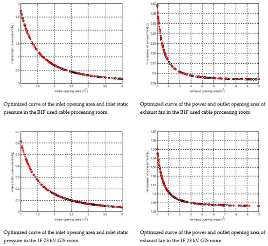 In this study, Matlab 2015b is used to simulate the relation between the inlet and outlet opening area of the ventilation system in the equipment room, the static pressure of the opening, and the horsepower of the exhaust fan under the double MOPSO (Figure 4). In the substation optimization results, in the B1F underground used cable processing room, the inlet opening area is ~2.5 m2, the inlet opening static pressure is ~0.49 mmaq, the outlet opening area is ~2.9 m2, and the power of outlet opening exhaust fan is ~0.803 Hp while that of the exhaust fan is only 0.75 or 1 Hp. To satisfy the dynamic conditions, a power of 1 Hp was selected. In the 1F 23 kV GIS room, the inlet opening area was ~2.5 m2, the inlet opening static pressure was ~0.1 mmaq, the outlet opening area was ~2.8 m2, and the power of the outlet opening exhaust fan was ~1.49 Hp while that of the exhaust fan machine was only 1 or 075 Hp. To satisfy the dynamic conditions, two powers of 0.75 Hp were selected. As for others in the equipment room, because the design already adopted a power of 0.5 Hp or less for the minimum horsepower model of the exhaust fan, there was no planned double MOPSO for optimizing the outlet power.