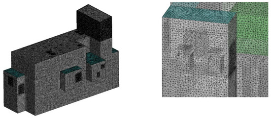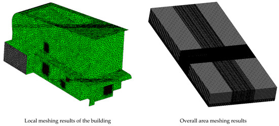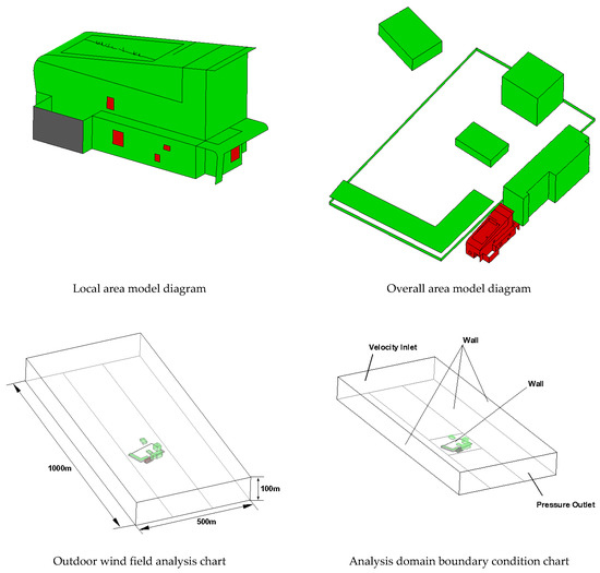 For the BIM of the substation to be as close as possible to the real outdoor atmospheric environment, the external overall calculation area is expanded further and the overall calculation area has dimensions of 1000 × 500 × 100 m3. Figure 5 shows the architectural model of the local area and the model of the overall calculation area. For the calculated project building, the detailed building structure is considered and the location area of the air outlet is separately divided. Note that for mesh division, Integrated Computer Engineering and Manufacturing-CFD is used. Considering the calculation accuracy and calculation time, the hexahedral structured mesh and tetrahedral unstructured mesh are used for the division. Because of the small size of the local area, such as the air port of the project building, the area mesh with a small local size is encrypted. The complex structure of the area near the project building is difficult to realize because of the fully structured grid of the local area; thus, for the surrounding area of the building, an encrypted tetrahedral mesh is used and a structured hexahedral mesh is used in the surrounding area of the building. For the area near the ground, considering the wind speed gradient of the atmospheric boundary layer, the grid of the ground area is encrypted. Moreover, the total number of grids is 7.5 million, as shown in (Figure 6). In 2018, the dominant wind direction of the substation area during summer and the whole year was the north wind, and the average wind speed in June, July, and August 2018 was 2.83 m/s. Therefore, the north wind direction is adopted for the calculation, and a wind speed of 2.83 m/s is used for analysis the condition of the calculation domain; furthermore, the distribution of the atmospheric wind speed boundary layer is considered.