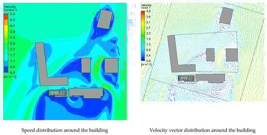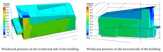 By repeated calculations using ANSYS FLUENT 18.0, the velocity and pressure fields of the whole calculation region were obtained. Figure 7 shows the velocity distribution and velocity vector at a height of 3 m around the building. The wind speed in the windward direction of the building is deflected because it is affected by the obstruction of the substation building. Furthermore, the wind speed in the windward direction or on the north side of the building is ~1.5 m/s, whereas that in the leeward or on the south side is 0.6 m/s or less. On the south side of the building, there is a recirculation zone, which facilitates the formation of a large ventilation pressure difference between the windward and leeward sides of the building. Figure 7 shows the surface pressure distributions of the windward and leeward sides of the building. The wind pressure on the windward side of the building is 0.0–2.0 Pa, while that on the leeward side of the building is between −1.5 and −1.0 Pa. Note that the top of the building is in the negative-pressure zone, and the exhaust fan is primarily located at the top. Therefore, for mechanical ventilation, the arrangement of the building air port and the fan is beneficial to the use of the building surface pressure difference formed by the outdoor wind field.