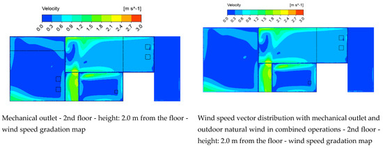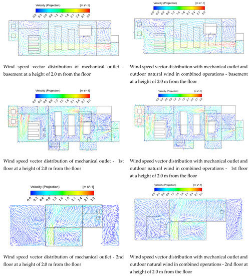For indoor flow field analysis, the analysis of two different flow field conditions is conducted to examine whether the indoor air inlet and outlet organization is reasonable and whether the existence of a short circuit and local wind speed is unreasonable. For the convenience of analysis, the cross-section and longitudinal section of the building are determined from a certain floor height. Figure 10 shows the cross-sectional position; it is 2 m from the floor. Note that the two longitudinal sections can completely capture all functional spaces. Under the conditions where only the mechanical outlet is available and where the mechanical outlet and natural wind are both available, the wind speed analysis in the basement, the ground floor, and the second floor at a height of 2 m from the ground are shown in Figure 11 and Figure 12, respectively. From the air inlet to air outlet, there is no short circuit in the main streamline structure; however, there are additional local eddy currents.