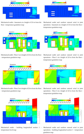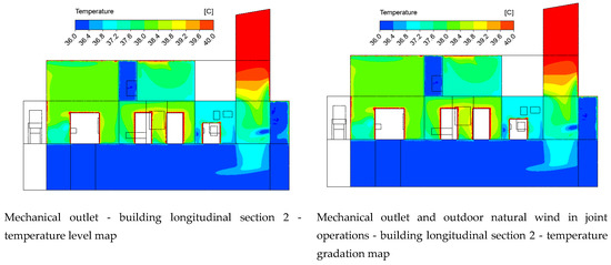 The results of indoor average temperature analysis under two conditions in the room are used to calculate the average temperature in different spaces of the room (Table 10). At an outdoor temperature of 36 °C, the indoor temperature is up to 38.3 °C and the design of the air volume meets the indoor heat dissipation requirements. On the first floor, the 23 kV GIS room and the main transformer room have the highest temperature. Under the conditions where mechanical outlet and natural wind are both available, only the temperature of the used cable processing room is slightly lower than that in the case where only the mechanical outlet is available; moreover, the indoor average temperatures under the other two sets of working conditions are the same. Figure 13 shows the indoor temperature distribution under the mechanical outlet conditions, the temperature at a height of 2.0 m from the floor on different floors, and the temperature distribution of the overall longitudinal sections of the building. Because the basement has no heat-generating equipment and the surrounding wall is underground, it is less affected by the outdoor air temperature and solar radiation; therefore, the indoor temperature is lower overall. The overall temperature of the ground floor and the second floor is higher than that of the basement. The 23 kV GIS room on the ground floor has a large calorific value of the device; therefore, the indoor temperature is relatively high. The longitudinal section’s temperature distribution shows that the upper part of the stairwell is at a high temperature of up to 40 °C because of the buoyancy of the rising hot air flow; however, the upper part of the stairwell is an enclosed space where hot air accumulates, resulting in a higher temperature in this area. We may consider adding a vent to the top of the stairwell or adding the ventilation louver on the door leading to the outside balcony at the top of the stair, which can both reduce the temperature in the top of the stairwell and use the chimney effect of the stairwell to form a higher hot-pressure ventilation effect, thus increasing the amount of natural ventilation.