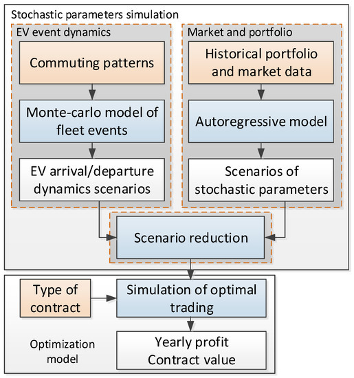 Figure 1. The model comprises two components, the simulation of the stochastic parameters and the simulation of the trading. The first component includes the simulation of the EV event dynamics and the simulation of market and portfolio parameters. These two sets of data form a complete set of parameters which, after being subjected to the scenario reduction, serve as an input to the trading simulation component.