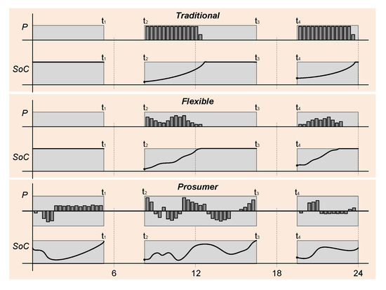 ), operator can charge (“Flexible”) or charge/discharge (“Prosumer”) the battery in a flexible manner (shaded area in