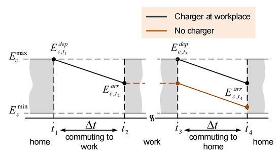 1), when the maximal energy content is reached, charging falls to zero until the departure to Home, which occurs at