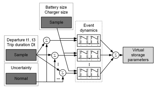 The equations defined above describe the charging dynamics for a single vehicle, and the introduced variables are stochastic. In order to simulate an entire fleet, a Monte-carlo framework will be adopted as described later in this section.