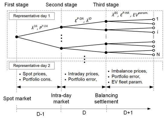 The market aggregator forecasts portfolio consumption/production and, based on these forecasts, buys/sells power on the day ahead market. We also assume the market aggregator is a balancing responsible entity. This means that the aggregator is financially penalized for mismatches in forecasts. Since our aim is to analyze the value of different contracts that the aggregator can offer to newly added electrical vehicles, it is necessary to consider this component of the portfolio separately. The three-stage stochastic optimization model describes these market operations, and a detailed description is provided in the following paragraphs.