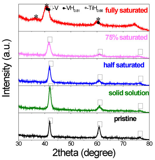 - Kumar, S.; Krishnamurthy, N. Effect of aluminum on solubility and β phase stability of vanadium-hydrogen system. Int. J. Refract. Met. Hard Mater. 2012, 35, 191–195. [Google Scholar] [CrossRef]