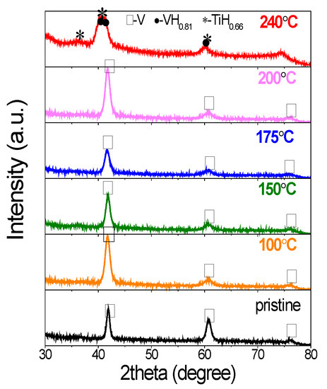 The structural and phase changes were also investigated by X-ray diffraction. As shown in Figure 5, the pristine V20Ti32Cr48 alloy showed typical BCC structure. The samples cycled up to temperatures: 100 °C, 150 °C, 175 °C, and 200 °C showed similar structure as evidenced from the presence of peaks at the same position. However, the XRD peaks were broadened after hydrogen compressor cycles due to reduced crystallite size caused by pulverization. Moreover, the intensity of the peak at 61.02° decreased, which was probably caused by the structure changes of metal matrix from BCC to the BCT structure [32,33,34,35]. On the other hand, the sample cycled at 240 °C showed multiple and overlapped peaks, which could be indexed by VH0.88 and TiH2 phases [3]. It is direct and obvious evidence for the disproportionation and phase separation, which occurred at this temperature.
