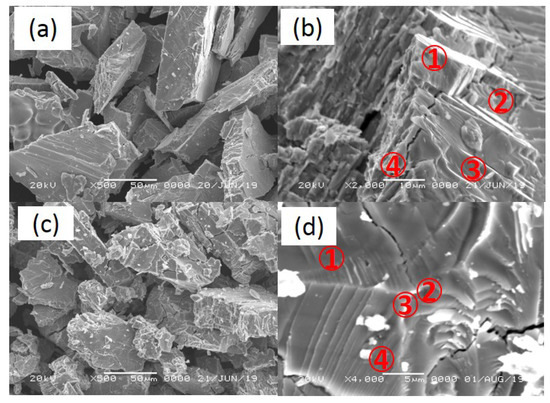 SEM morphology of pristine (a,b) and cycled (c,d) sample up to 240 °C with fully saturated H2.