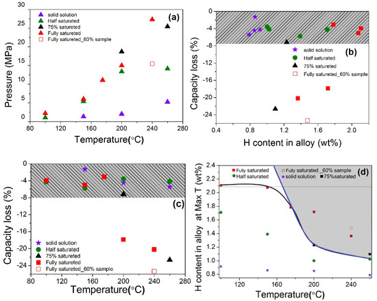 (a) The achieved max pressure of sample cell at maximum temperature for each hydrogen compressor cycle measurement; (b) the capacity loss of each state with the changes of H content remained in the alloy at high temperature; (c) the capacity loss of each state with max temperature for hydrogen compressor cycle; (d) H content remained in the alloy at achieved max temperature.