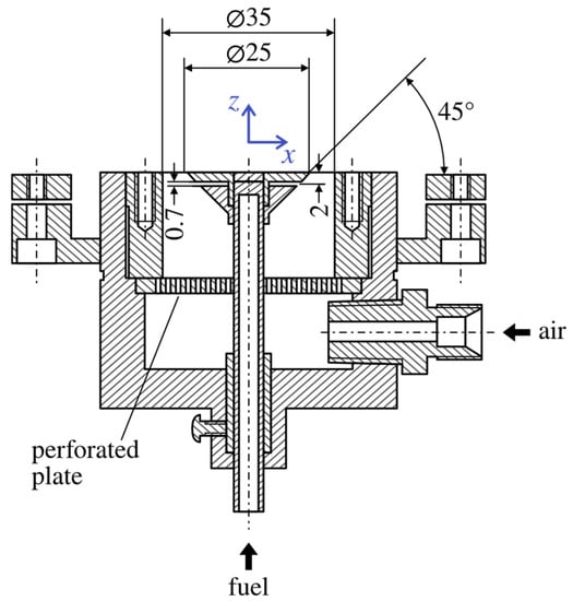 The measurements presented here were carried out in laminar and on turbulent diffusion flames. The burner was the same as in our previous work [20]. It is similar to that in References [14,15] except for a smaller plenum and the use of a perforated plate instead of the flow straightener to unify the flow field (Figure 1). The burner had an annular opening with an inner diameter of 25 mm and an outer diameter of 35 mm. Air entered the burner from the side, flowed through the perforated plate and exited the burner through the annular opening. The fuel was supplied through six radial bores in the centrally arranged conical bluff-body. The bores had a diameter of 0.7 mm and were located 2 mm below the bluff-body edge. The turbulence intensity was estimated previously to be ≈10% of the inlet velocity [20]. Thermal mass flow controllers (MKS Instruments) controlled the mass flow rates of fuel and air. All gases entered the burner at room temperature. The mass flow of fuel (methane or ethylene) in most measurements was in the range of 1–2 slm (standard liter per minute), while the air flow was varied from 10 slm (laminar case) to 100 slm (turbulent case), resulting in an exit velocity of the fuel/air mixture of about 0.4 or 3.6 m/s, respectively.